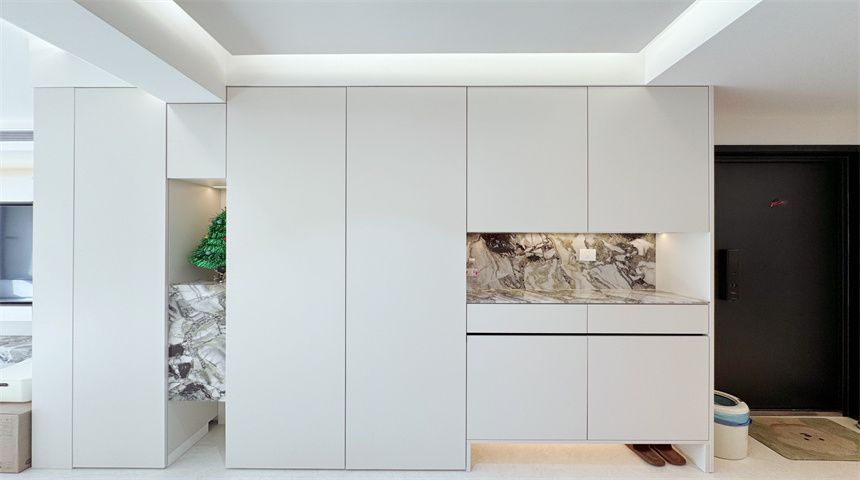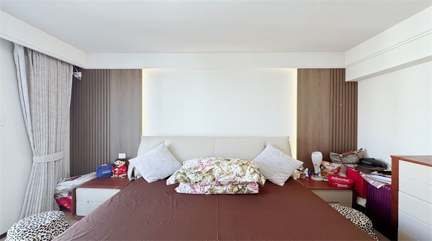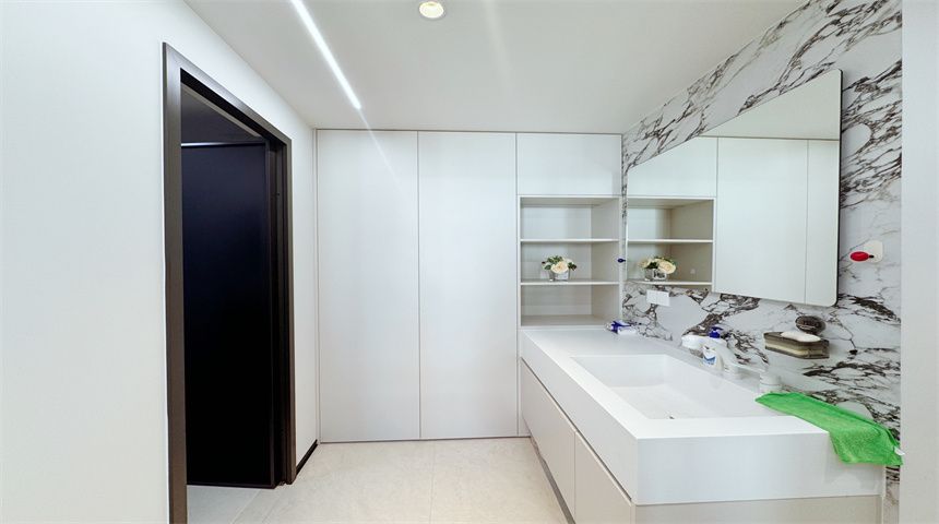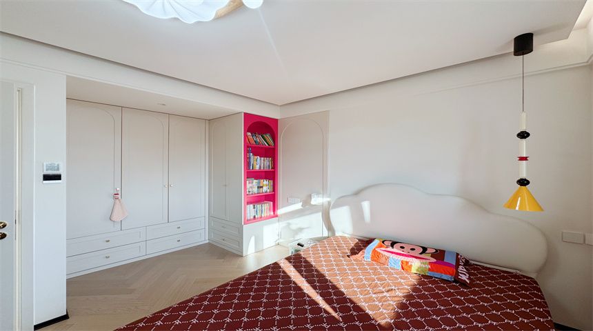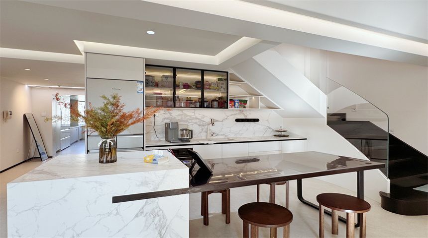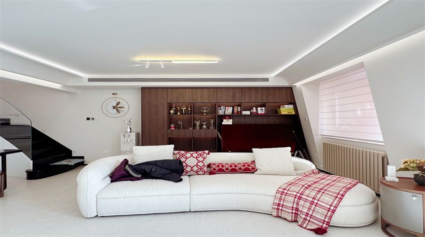 本案为轻奢风复式装修。首先一层进门是一个玄关柜,门右边是一个定制的鞋柜,中间镂空位置用岩板做台面。客厅通铺750*1500大地砖,顶面做了圆弧造型,还有线型灯条。做了中央空调长条出风口。定制了简约风的电视背景墙,下面是岩板材质的台面。沙发后面做了定制书柜,美观又实用。楼梯旁边是西厨,做了整体定制的一个岛台,还有定制柜体。冰箱做嵌入式设计,合理利用空间。中厨墙地面铺了750*1米5的大砖,定做了U字型的橱柜,还有一个大双开门的内嵌冰箱,顶面做了集成的吊顶。卫生间三分离设计,做了洗漱的定制台面,还做了定制的储物柜,收纳空间满满。湿区做了一字型推拉门,还有带花纹的墙砖,还做了壁龛,实用性拉满。老人房铺了木地板,纹理自然,易于打理。做了中央空调和新风。做了暗藏式窗帘盒,还有圆弧垭口。楼梯踏板采用了深色的木材,而侧面和扶手则采用了透明玻璃材质,在视觉上形成了鲜明的反差,增强楼梯设计感。二层顶面做的是整体的平板吊顶,加上射灯跟线型灯。小女儿房定制了到顶的衣柜,右侧的书柜内部是鲜艳的玫红色,并且设计有多个隔层,拱形开口更具趣味性。做了整体定制的书柜和写字台,右侧是玻璃门设计,视觉明亮。主卧室做了整体的悬浮吊顶,加上双眼皮和线灯射灯,做的是无主灯设计。床头做了整体护墙板的一个床头设计。阳台处的门洞做了弧形的大垭口,做了双边的双眼皮的边线,这个对师傅的工艺手艺要求特别高,整体的效果质感都是非常ok的。还做了一门到顶的定制衣柜。主卫生间干湿分离,铺了600*1200的墙砖,做了下沉式淋浴房,还有线型的长条地漏,顶面做的集成吊顶二层的卫生间同样三分离设计,干区做了定制浴室柜。独立淋浴区的墙面铺贴了600*1米2的花砖,做了壁龛。大女儿房地面铺了人字形的实木地板,脚感舒适。顶面同样做了无主灯的悬浮吊顶,还做了双眼皮的边线。做了定制的小地台柜,收纳休息两不误。做了粉色弧形的木质床头背景,同样做了定制的书柜和衣柜。