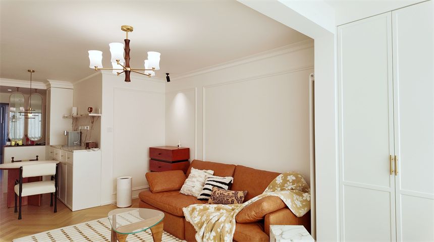 本案为轻法式装修。人字拼木地板通铺,步入房间,左手边即为厨房,采用二字型橱柜设计,墙面大砖上墙,顶面做筒灯、线型灯,一面墙的柜子便于储物,家电嵌入进柜体。次卧简单设计,定制衣柜一板到顶,摆放了床铺,安装了个性化的床头灯。卫生间洗衣机烘干机嵌入进柜体,钻石型的淋浴房,洗手盆做复古设计。餐厅区域采用圆形餐桌,顶面做吊灯,餐边柜定制柜体,台面采用岩板做台面。客厅墙面做太阳线进行装饰,顶面设计筒灯作为辅助照明,做钢琴线石膏线,阳台一侧做柜子增加储物空间。主卧床头背景墙同样采用太阳线进行装饰,顶面做钢琴线石膏线,做壁灯+吊灯辅助主灯照明,做步入式衣柜,美观又不占用空间。