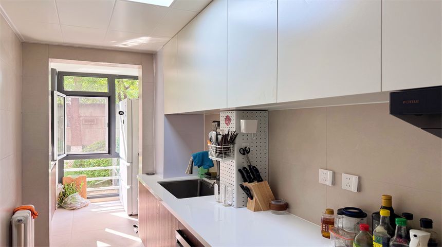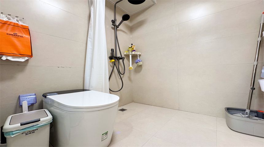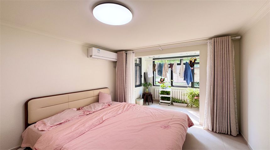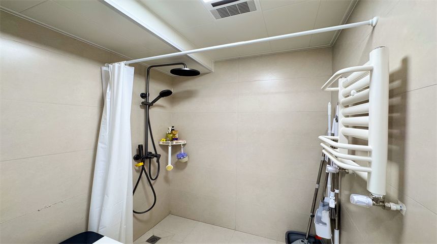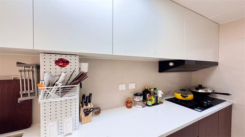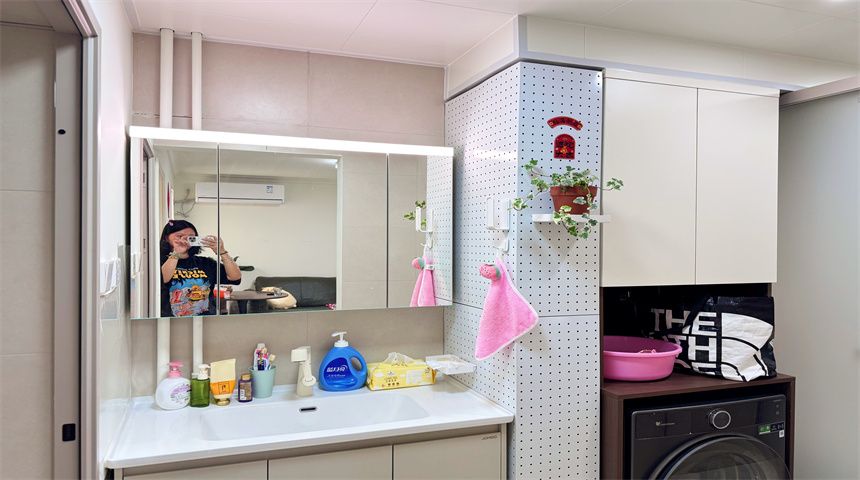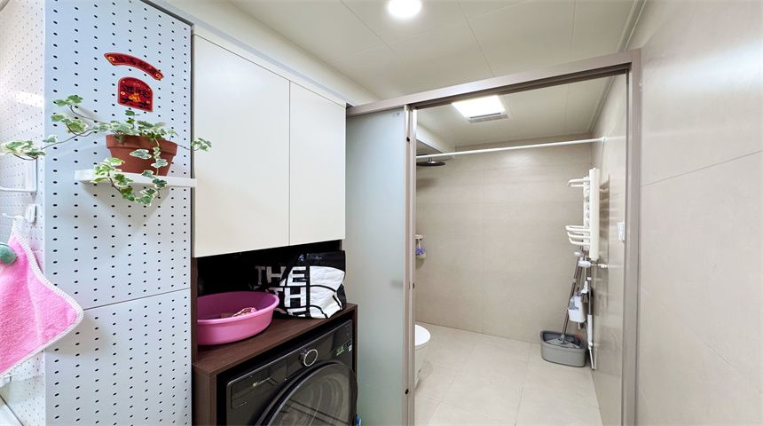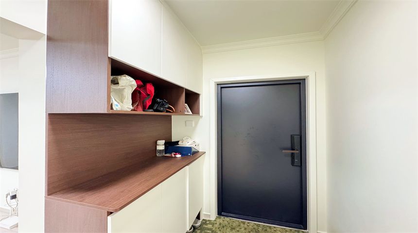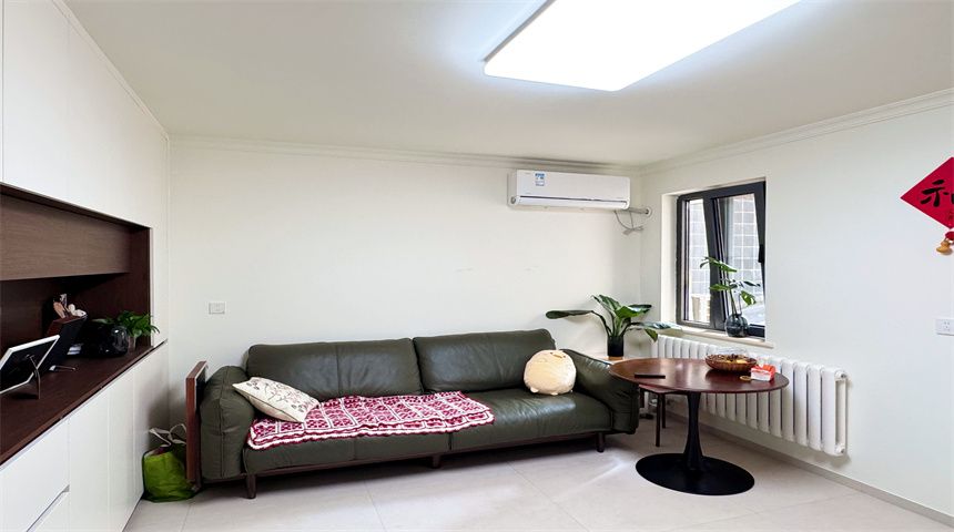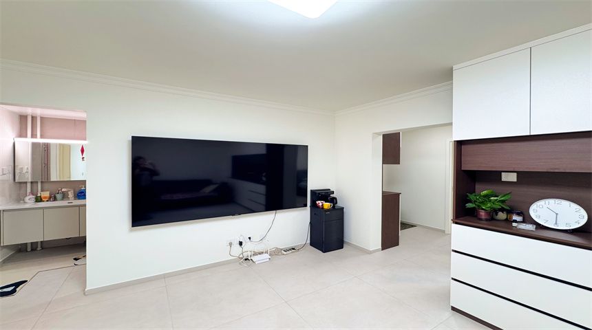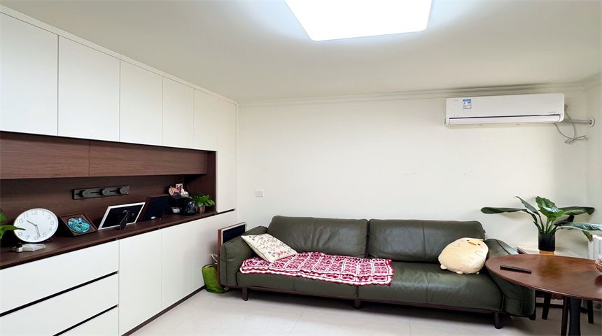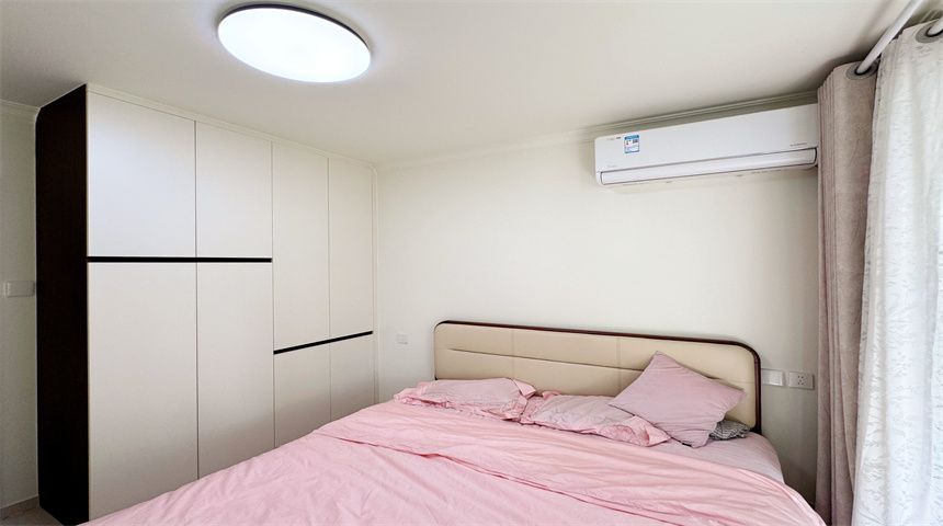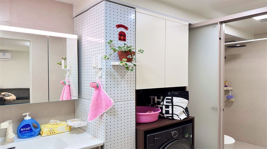 本案为简约风三居室装修。进门首先是玄关柜,作为简单的置物使用,也当作鞋柜使用。正对入户门的墙面做了门的移位,使次卧门不正对入户门。次卧书房都是简单设计,地面800*800地砖通铺,顶面双眼皮石膏线,床、衣柜、书桌一应俱全。客餐厅一体化设计,电视背景墙拆改移位,因为要挂电视,将轻体墙改为红砖墙。餐边柜到顶不留缝隙,中间做轨道插座,方便电器使用。主卧也是简单设计,通体大衣柜,阳台采光充足。卫生间干湿分离,洗手盆外移,为了扩大空间拆除原墙体,用洞洞板包裹下水管道,美观实用,洗衣机做嵌入式设计,湿区做推拉门,墙面400*800的薄贴法,淋浴区用帘子简单隔离。厨房采用一字型橱柜设计,墙砖400*800,冰箱放置阳台。