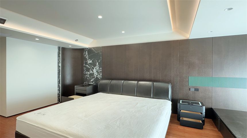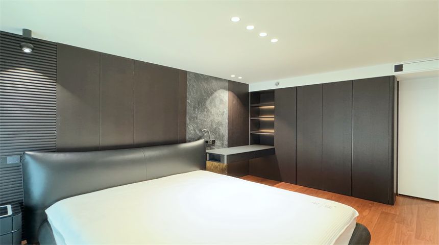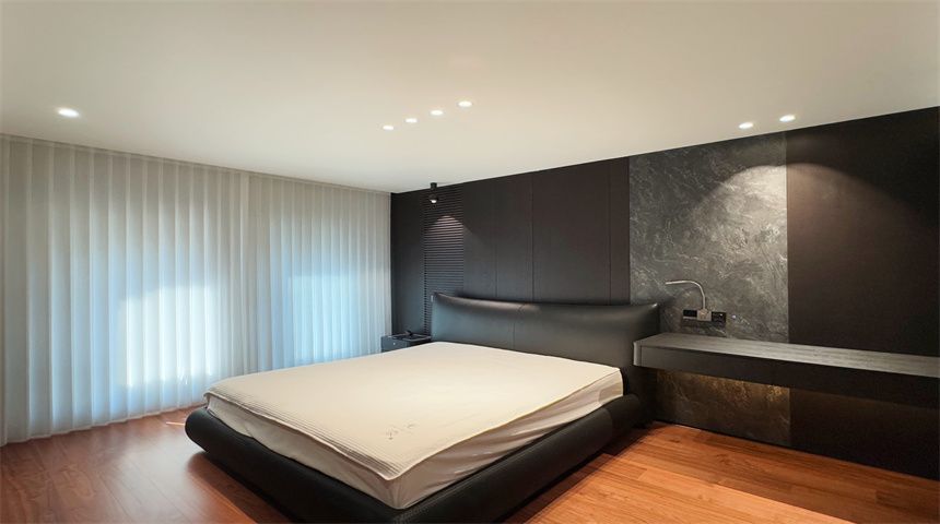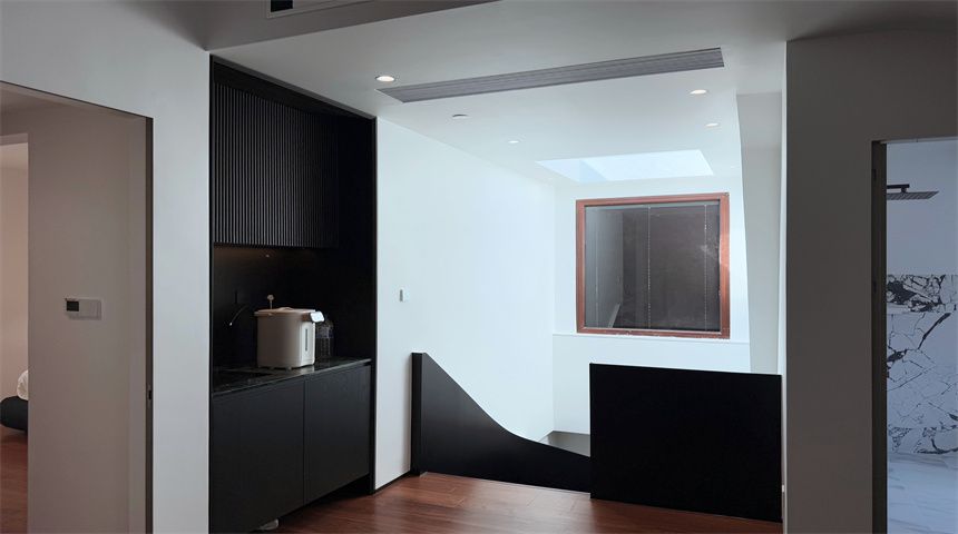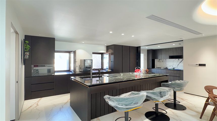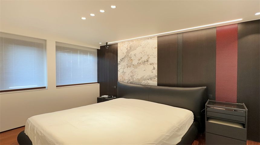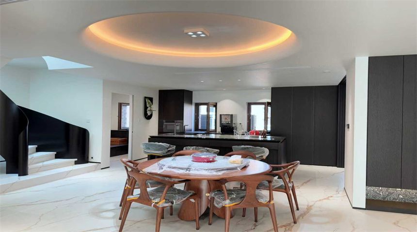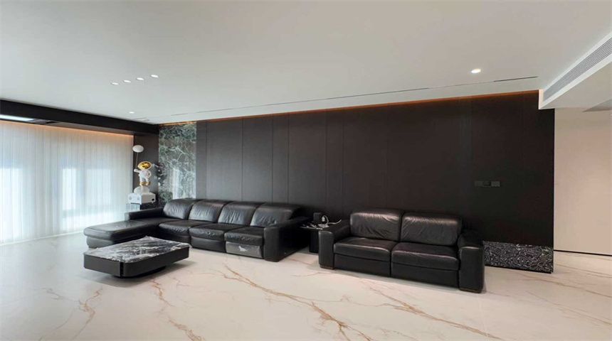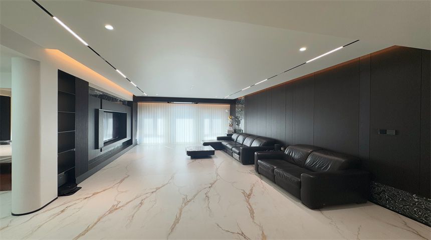 本案为意式风装修。400平米两层复式,地面大砖铺贴,无主灯吊顶,中央空调,楼梯扶手钢板氟碳喷漆,餐厅顶面GRG圆弧造型。推门入户,首先是一层空间,右侧是一组玄关柜,左边是客厅,地面1800*900的大砖通铺,顶面无主灯吊顶,选择筒灯+线形灯进行组合照明,全屋中央空调。电视背景上下做线形灯带,85英寸大电视,门边处墙体做圆弧处理,沙发背景墙采用实木护墙板。厨房西厨中间做大岛台,靠墙一侧做整体橱柜,里面做中厨,中间部分采用大花砖,电器做嵌入式。餐厅顶面做GRG圆弧造型,搭配线形灯美观大方。主卫做墙排洗手盆,壁挂马桶,极窄边框的玻璃淋浴房,墙面铺贴1200*600大花砖。主卧通顶大衣柜,做悬浮写字台,床头背景墙做跳色+格栅设计,床尾柜也是通顶大衣柜+梳妆台。通往次卫过道摆放绿植,顶面做晴空灯,次卫做墙排洗手盆,墙面1200*600的大砖铺贴,做壁龛置物。次卧铺木地板,靠次卫一侧墙面砌玻璃砖。楼梯扶手采用钢板氟碳喷漆,台阶做感应灯,二楼进门空间做成会客茶室空间,靠墙定制做的储物柜兼展示柜。主卧空间,沿过道做了两排嵌入式大衣柜,床头背景墙做了一个弧形设计,顶部做异形吊顶,主卫做独立淋浴房、洗手盆、马桶、大浴缸,汗蒸房。次卧、客卧也做了大衣柜,床头背景墙。