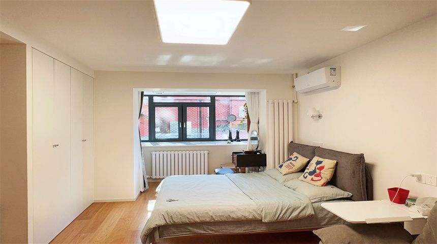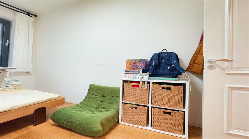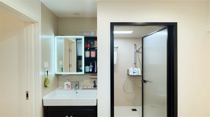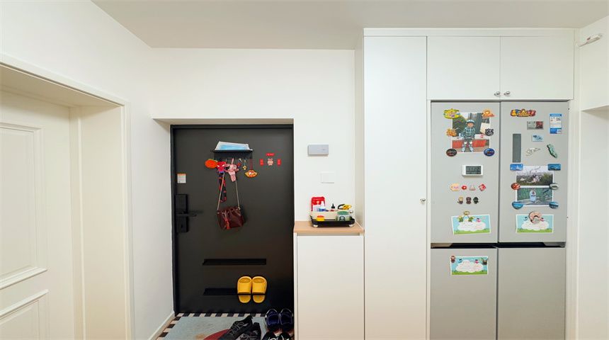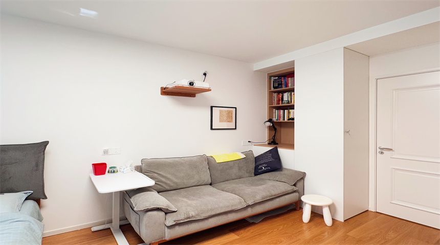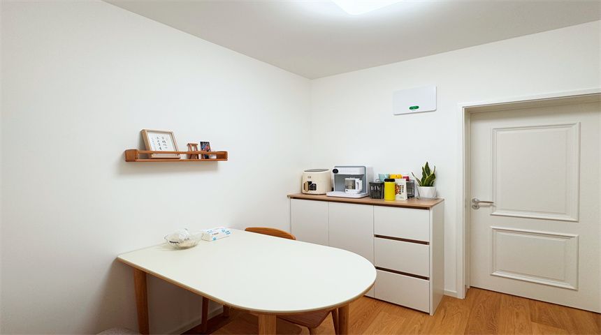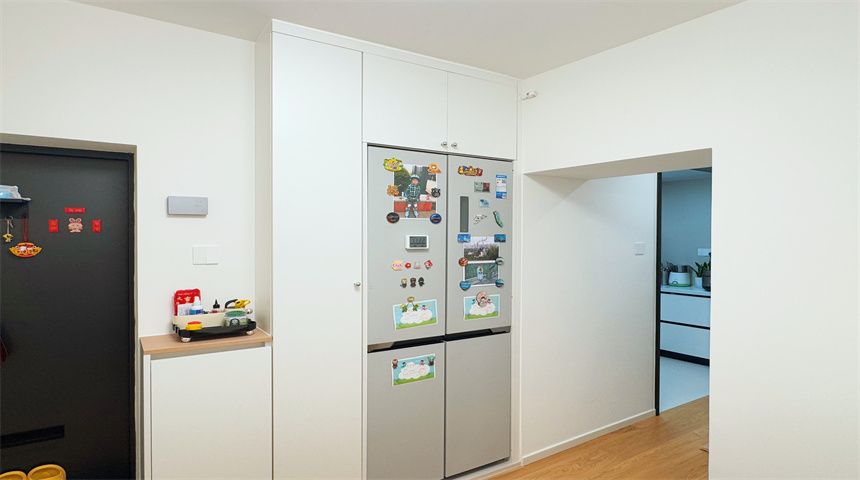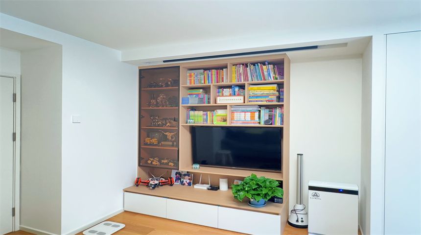 本案为简约风老房改造,60平米。老房空间较小,进门后的小厅,作为餐厅空间使用,餐桌搭配小餐边柜,入户门的左手边做了一组柜子,冰箱嵌入进柜体,因为这个地区是向外凸出的,所以柜子内部还有不小的空间。全屋通铺木地板。往里厨房卫生间位于过道两侧,左手边是开放式厨房,做U字型橱柜,铝扣板吊顶。右侧是卫生间,洗手盆作为干区,湿区马桶、毛巾架、淋浴一应俱全,并且门后还做了个小的洗手盆,方便早上分开洗漱。里面主卧与客厅安排在同一空间,靠门一侧是客厅,电视柜,沙发,投影幕布。靠阳台一侧作为主卧空间,简易衣柜既节省空间又能更多储物,阳台的两端一边摆放梳妆台,另一边摆放洗烘一体机,台面作为晾晒区域设计合理。儿童房简单温馨,同样设计金属衣柜,省钱实用。
