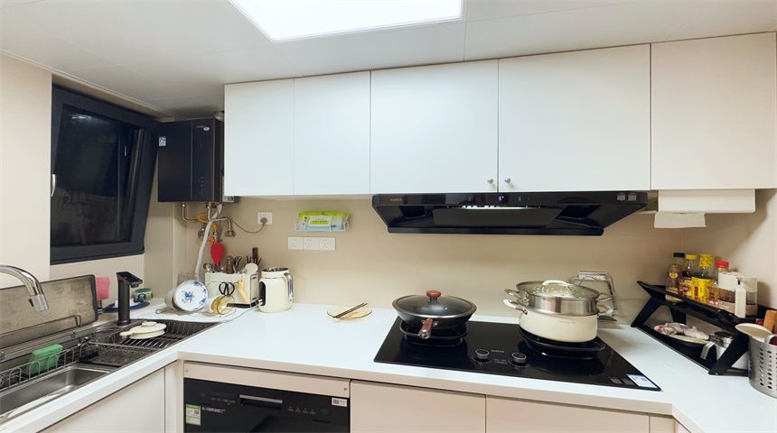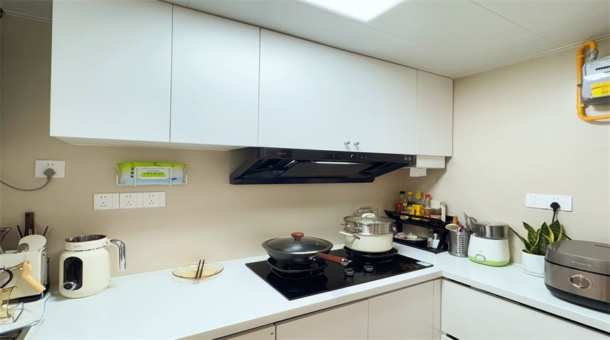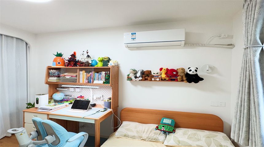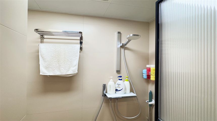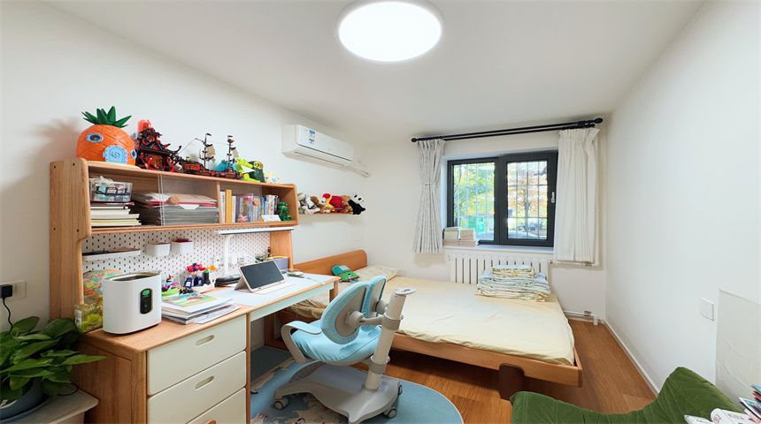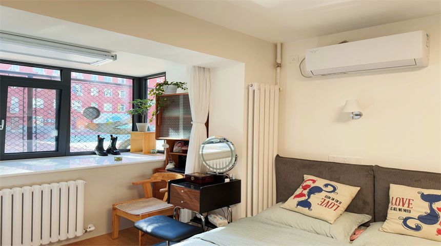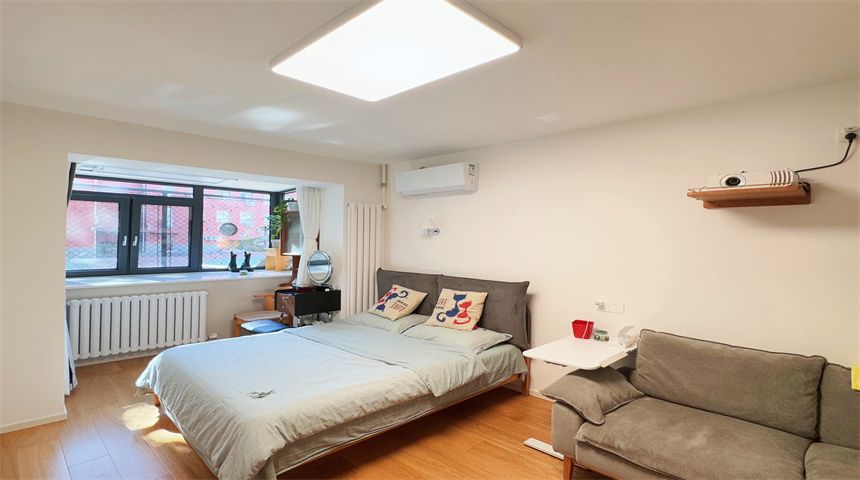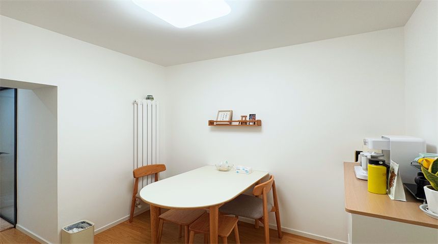 本案为简约风老房改造,60平米。老房空间较小,进门后的小厅,作为餐厅空间使用,餐桌搭配小餐边柜,入户门的左手边做了一组柜子,冰箱嵌入进柜体,因为这个地区是向外凸出的,所以柜子内部还有不小的空间。全屋通铺木地板。往里厨房卫生间位于过道两侧,左手边是开放式厨房,做U字型橱柜,铝扣板吊顶。右侧是卫生间,洗手盆作为干区,湿区马桶、毛巾架、淋浴一应俱全,并且门后还做了个小的洗手盆,方便早上分开洗漱。里面主卧与客厅安排在同一空间,靠门一侧是客厅,电视柜,沙发,投影幕布。靠阳台一侧作为主卧空间,简易衣柜既节省空间又能更多储物,阳台的两端一边摆放梳妆台,另一边摆放洗烘一体机,台面作为晾晒区域设计合理。儿童房简单温馨,同样设计金属衣柜,省钱实用。