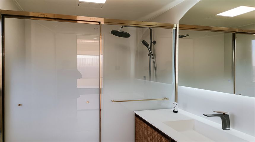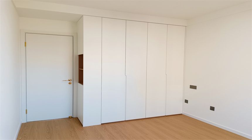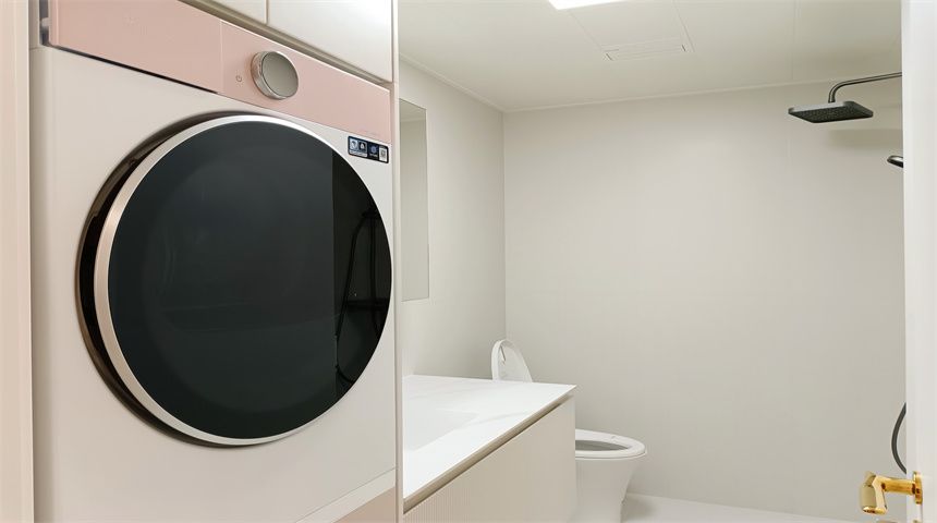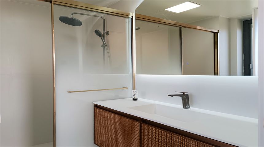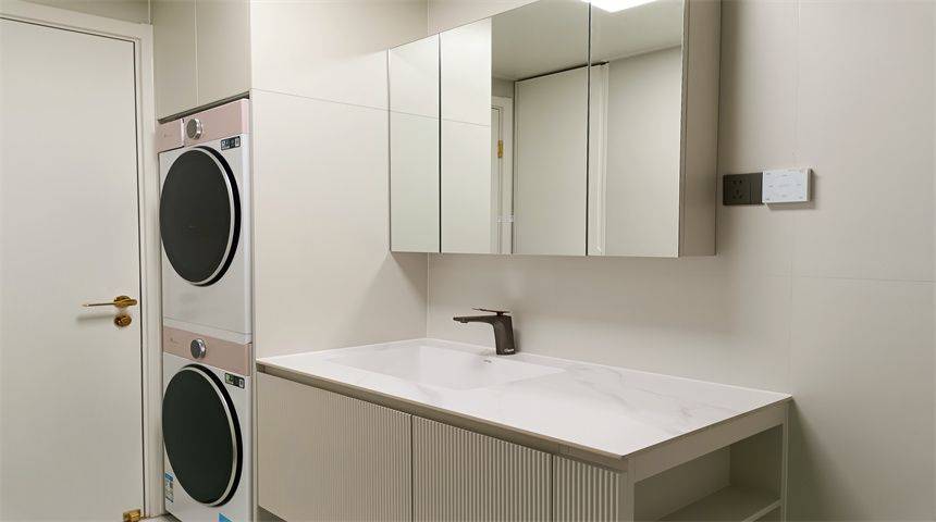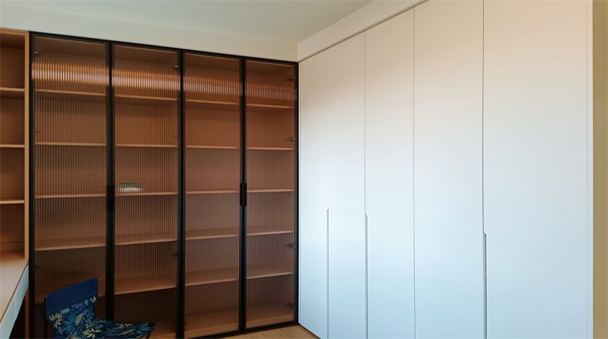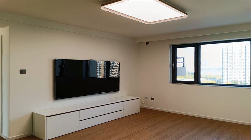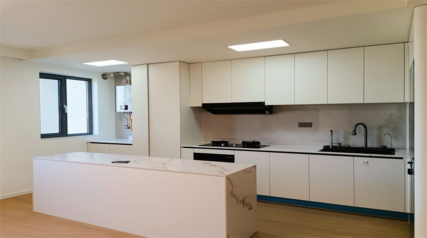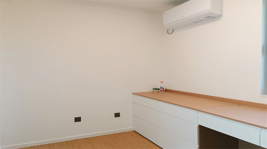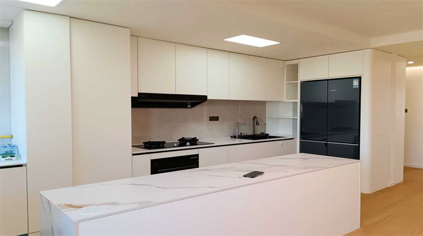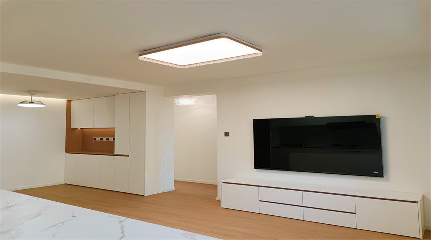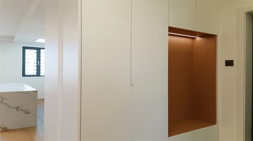 本案为奶油小清新风格。三居室开放式厨房,木地板通铺。推门入户首先右手边是玄关柜,左手边是客卫,壁挂洗脸盆、岩板台面、智能镜,侧面做了小壁龛,台面不做挡水条更美观,下沉式淋浴房,洗衣机烘干机也放置在这一空间内。转过身是书房空间,一体的工作台,书柜,一板到顶的大衣柜。整个餐厅过道区域做了吊顶,安装筒灯,见光不见灯的暗藏灯带,餐厅区域顶部是带风扇的吊灯,餐边柜安装轨道插座,感应灯带,餐桌等待后续摆放。原本的厨房轻体墙在工长与业主协商后拆除,打造开放式厨房,客厅厨房连城一体,空间宽敞明亮,地面木地板通铺,厨房L型橱柜,嵌入式家电,岩板台面,墙面大砖铺贴,管道被包进柜子里,美观大方,还做了岛台。过道空间做了造型小吊灯,次卧床还没有安装,全屋定制的一板到顶大衣柜,顶上做了柜帽,做了窗帘盒。主卧空间宽敞,阳台做了电动晾衣架,因为床要与主卫间做隔档,做了一个储物柜,也增加储物空间,主卫门采用长虹玻璃+极窄边框的组合,壁挂洗手台,智能镜,智能马桶。湿区用推拉玻璃门隔开,干湿分离。