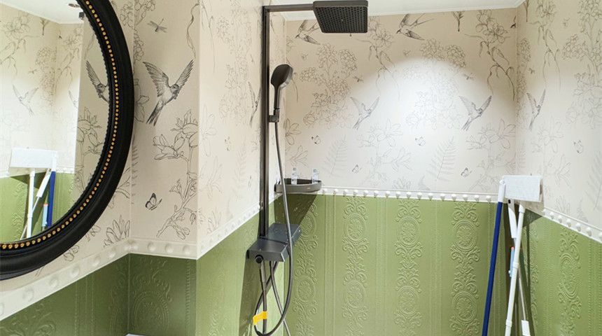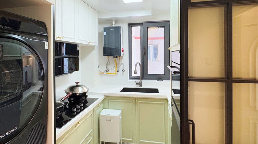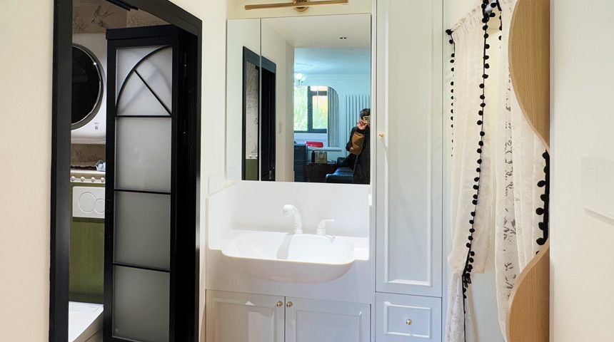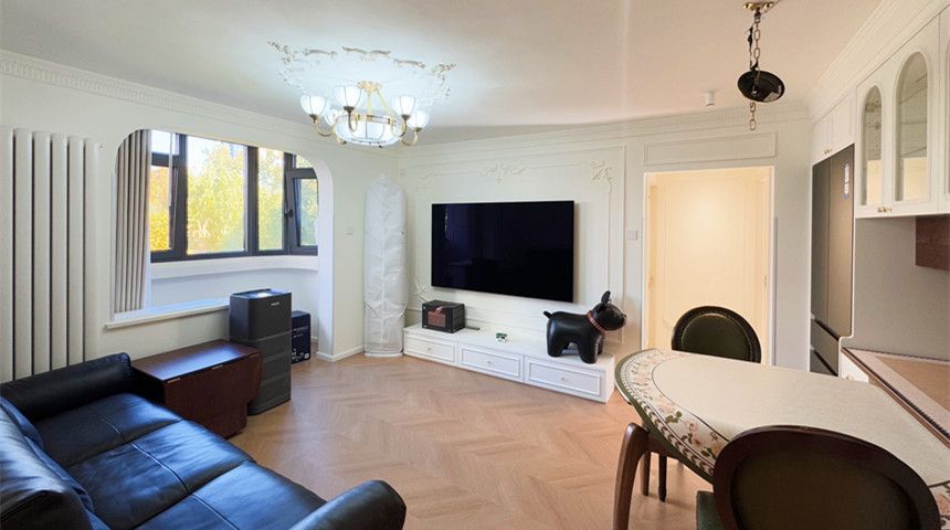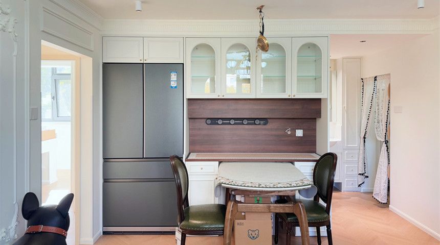 卫生间采用干湿分离。过道处做了定制洗脸盆,干区也安排上。地面铺设小花砖,墙面做了腰线,上下部分墙砖做不同颜色,搭配超绝。还有壁挂式马桶和折叠PE客厅走简约风,顶部做了造型花盘。沙发和电视背景墙都做了法式石膏线花线,氛围感拉满。餐桌能推进餐边柜省空间,餐边柜上方是法式酒柜,冰箱嵌入式设计。阳台做了弧形垭口,左侧打了储藏柜,收纳空间满满厨房装了推拉门,更好的隔绝油烟。做了定制橱柜,上方都是储物柜