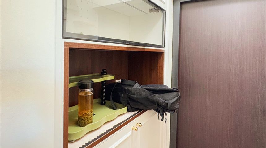 次卧做了镶嵌式柜子,吊顶四周做石膏线主卧吊顶围了一圈花线,还做了嵌入式衣柜,省空间又整洁。圆形阳台工艺需求超高,定制榻榻米下方全是储物空间