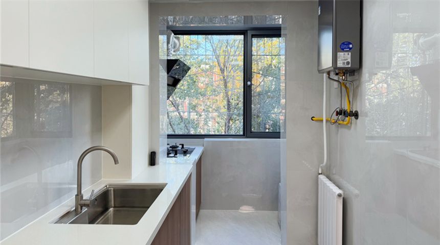 厨房打造成开放式,垭口用铝合金收口;800*800地砖直接上墙,做了高柜,还嵌入了蒸烤一体箱,颜值和实用性并存