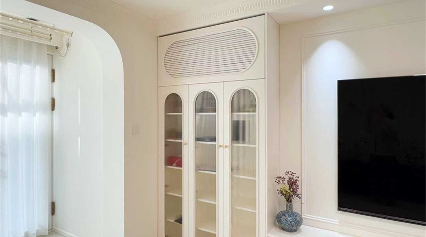 客厅地面大砖通铺,顶面做钢琴线石膏线,沙发背景墙做法式石膏线装饰,阳台连接处做拱形垭口,电视背景墙做立柜,下部分作为储物柜,顶部可将空调隐藏,保持整体美观。