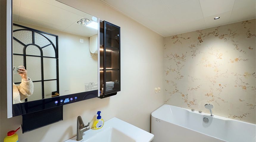 主卧卫生间安装洗手盆、镜柜、马桶、浴缸背靠墙面做满墙花砖,热水器半藏于吊顶。