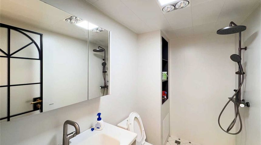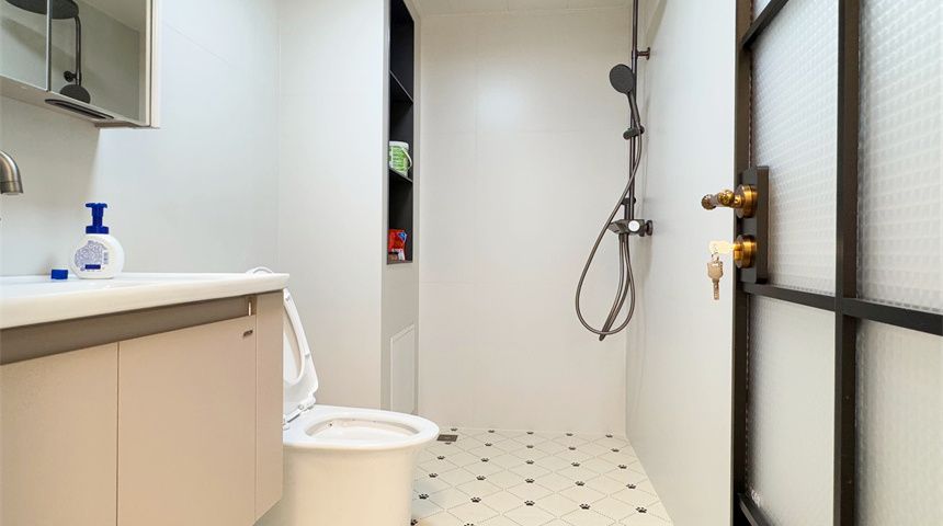 次卫地面小花砖铺贴,管道被整体包裹,还做了壁龛,洗手盆、镜柜、马桶、淋浴一应俱全。