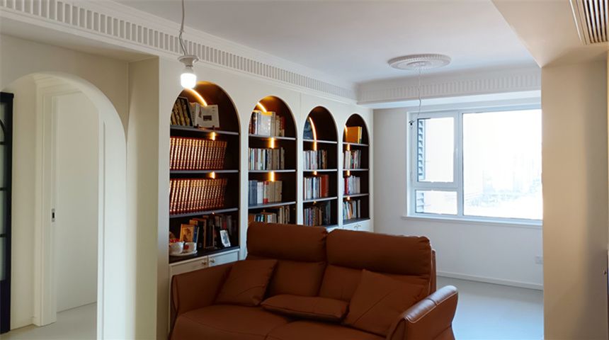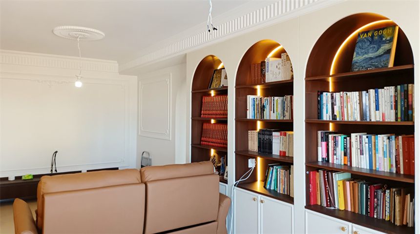 客厅顶面搓衣板石膏线,中央空调加长通风口,造型灯盘,电视背景墙做法式石膏线,装有书柜内部安装有灯带。