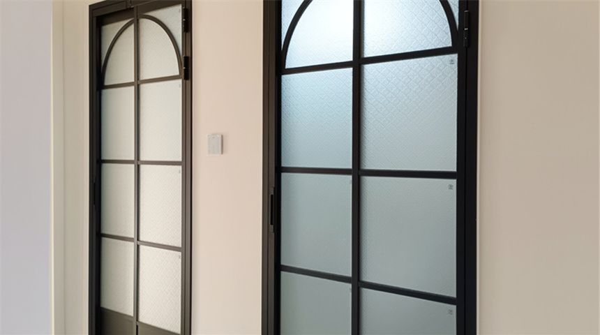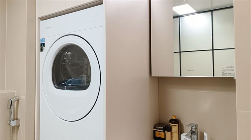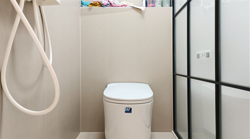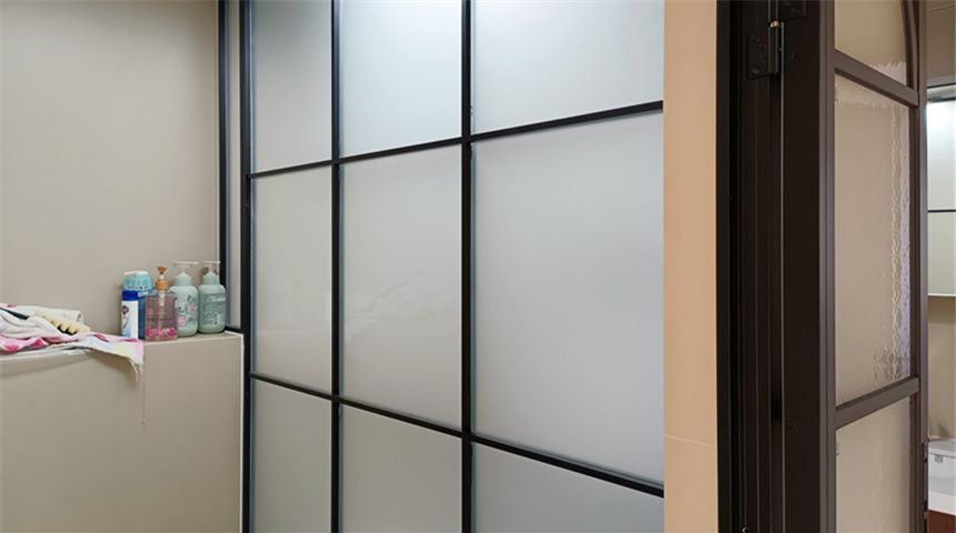 卫生间分为两部分,一侧做干区做洗手台,壁挂马桶,洗衣机烘干机嵌入式设计,中间用玻璃墙做隔断,湿区做马桶和淋浴,门为法式风格的PD门。