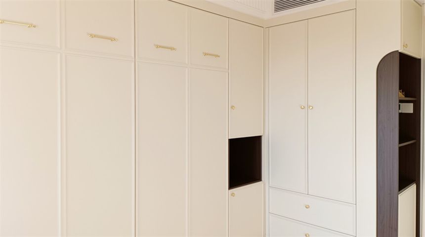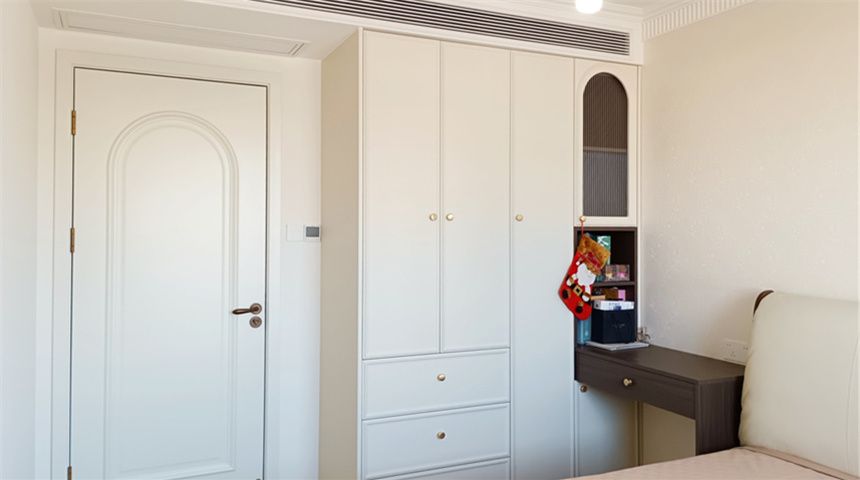 主卧做通顶衣柜,中央空调加长通风口,做窗帘盒,床头背景墙贴壁布。