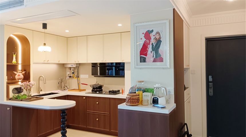厨房改造拆除原有墙体做开放式设计,L型橱柜,墙面大砖上墙,冰箱做嵌入式设计,采用吊灯+筒灯的照明方式,侧面做有小壁龛。