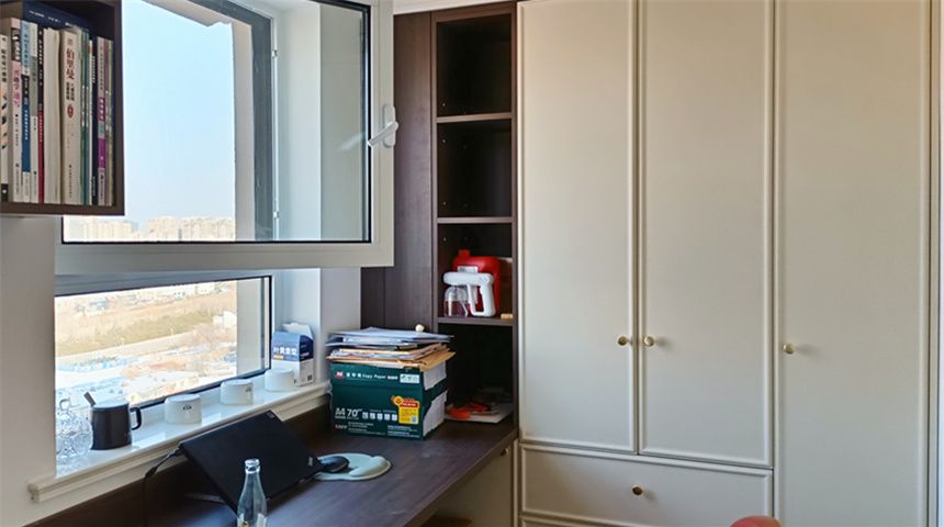书房做一体柜,中间部分可拉开作为床使用,阳台做休息区,可看书或工作。
