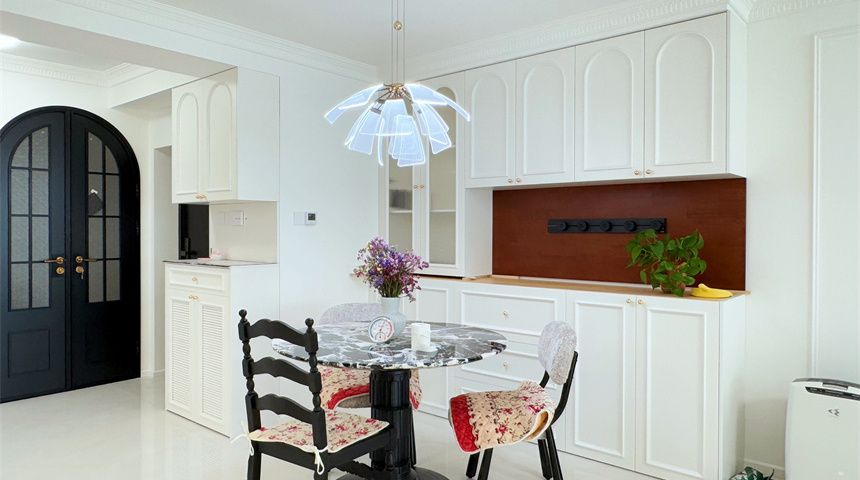 客餐厅空间一体,餐厅做餐边柜,圆形小餐桌,顶面有造型吊灯,设计美观。