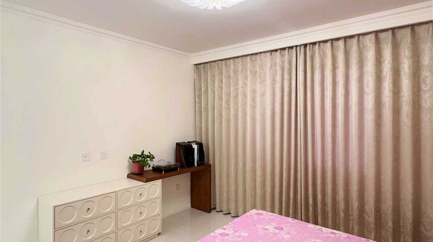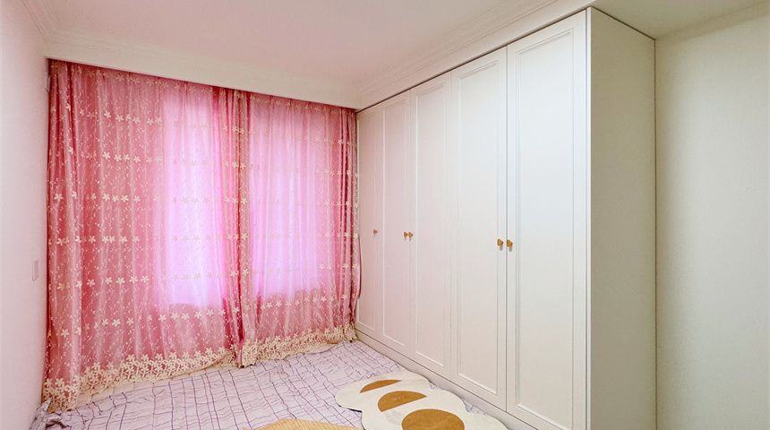 主卧做定制衣柜、电动窗帘,床铺和床头柜也非常契合法式风格。