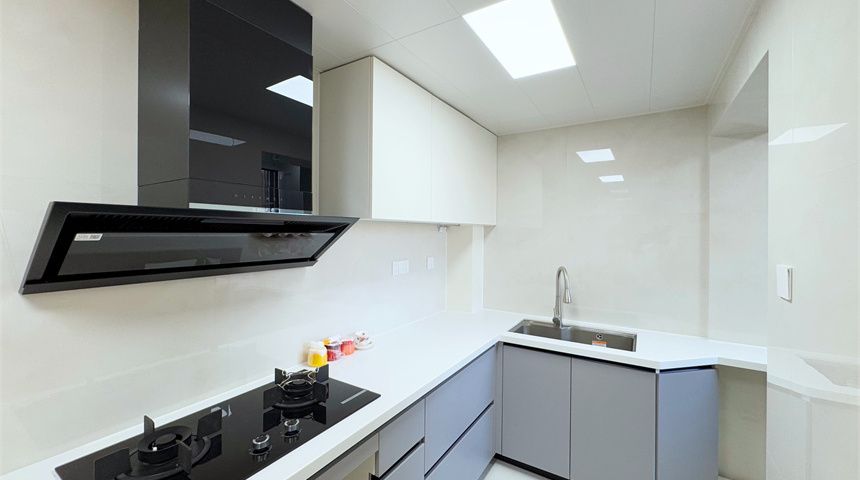 厨房做L型橱柜,墙面都是800*800大砖铺贴。