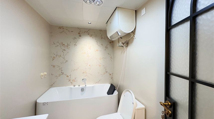 主卧卫生间安装洗手盆、镜柜、马桶、浴缸背靠墙面做满墙花砖,热水器半藏于吊顶。