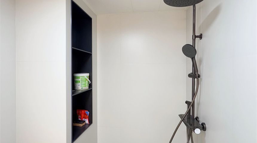 次卫地面小花砖铺贴,管道被整体包裹,还做了壁龛,洗手盆、镜柜、马桶、淋浴一应俱全。