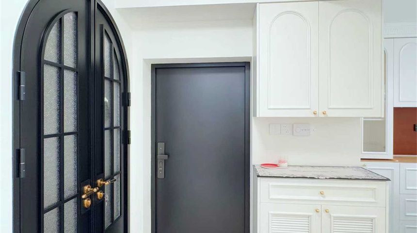 推门入户空间规划清晰左手边是鞋帽柜,右边是储物柜,门的设计非常有法式风格特点