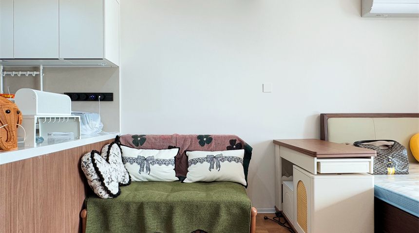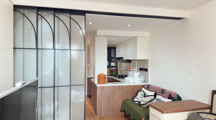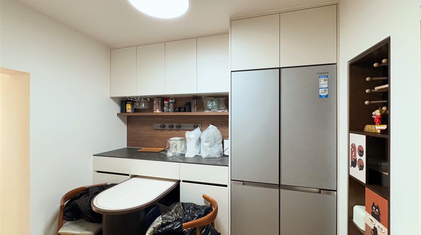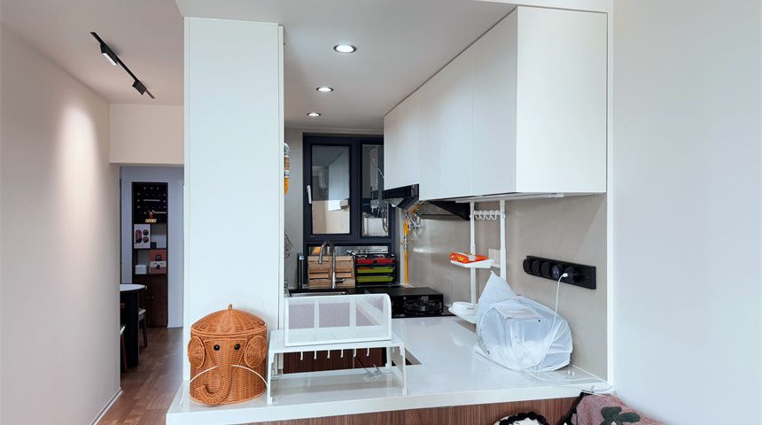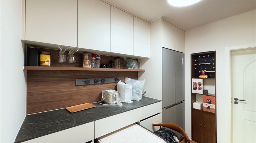 厨房采用开放式设计,通透感直接拉满,顶部做了石膏板吊顶。油烟机烟道暗藏墙内,美观又实用,整体平整度超高。800*800大砖薄贴上墙,质感在线,燃气管道也藏进小柜子里,颜值瞬间提升