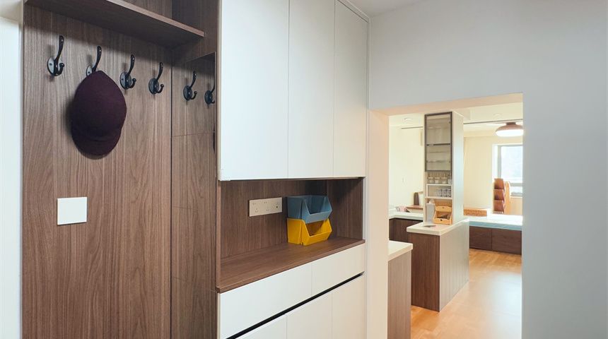 案例说明:客餐厅通铺600*1m2木地板,脚感温润舒适。冰箱嵌入定制柜体,旁边还做了嵌入式收纳柜,并且打造了实用吧台。天花板没有石膏线,做了阴阳角找直