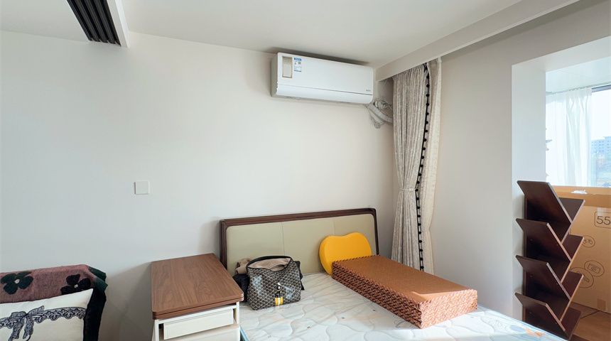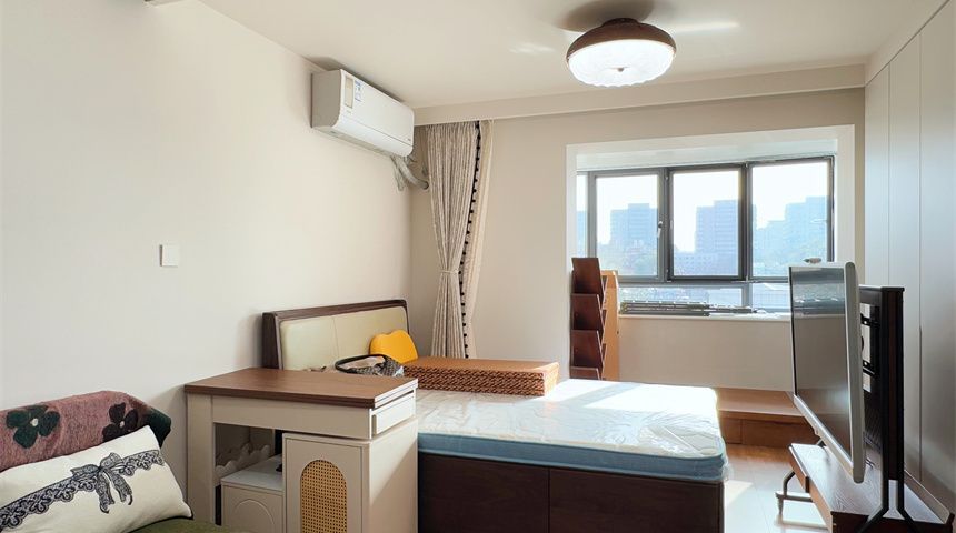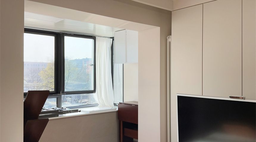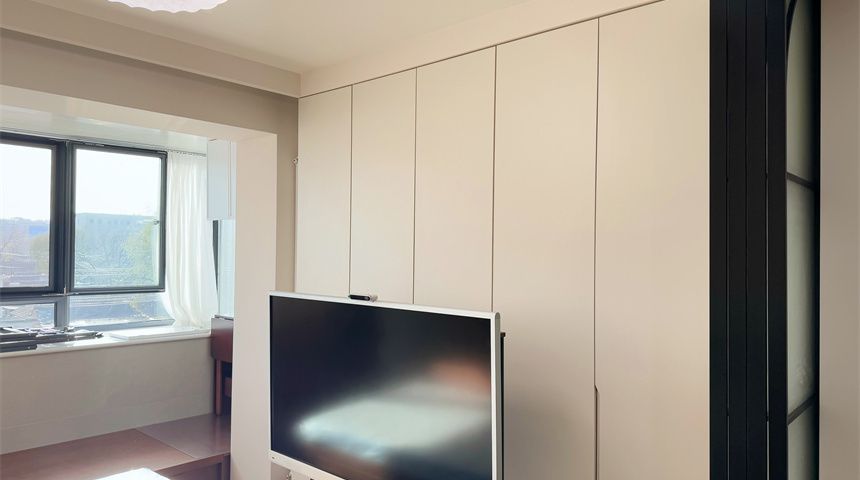 主卧装了四联动推拉门,不占空间还显通透,整面到顶定制衣柜收纳力超强;搭配可移动电视,便捷性拉满。阳台两侧打造了收纳柜,储物空间足足的