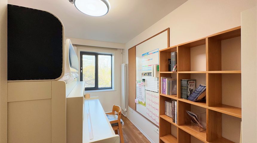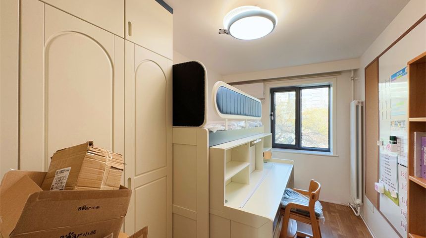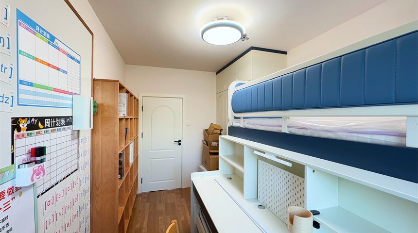儿童房同样铺了木地板,天花板走简约风,不做多余装饰。房间里摆了上下床,再配个成品衣柜,满足孩子日常起居和收纳需求