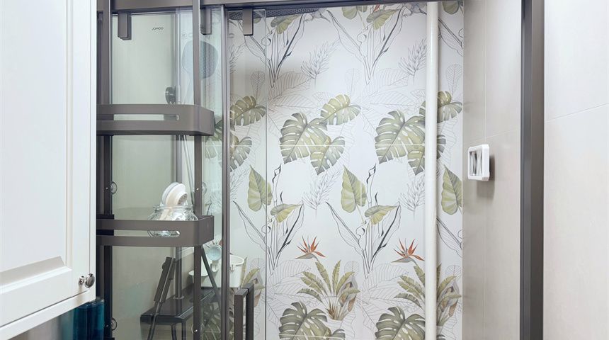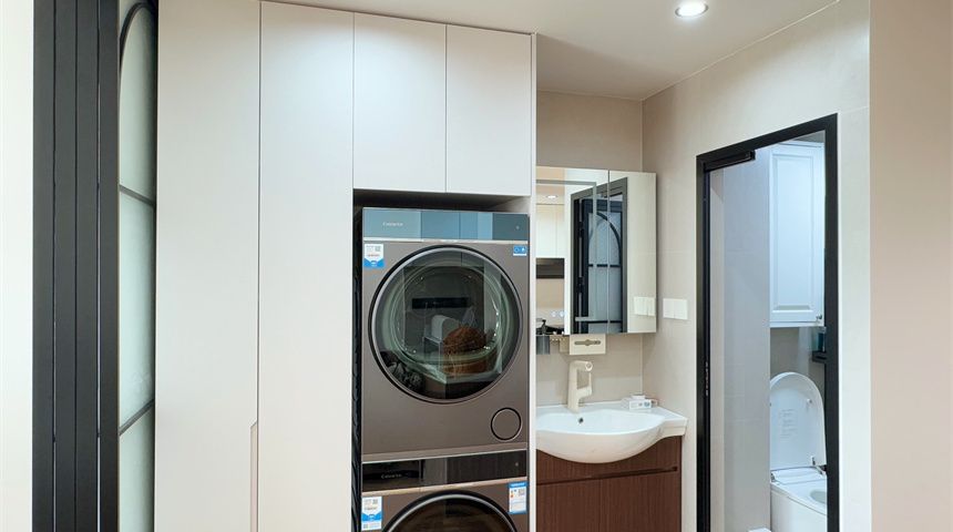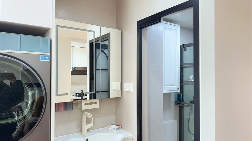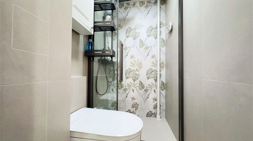 卫生间做了干湿分离,干区是悬浮洗手台,洗衣机嵌入定制柜,整洁不凌乱;湿区装了壁挂马桶,淋浴区配二联动推拉玻璃门,墙面贴小花砖,精致又有格调