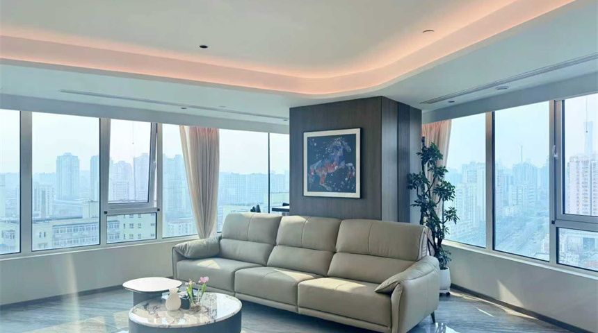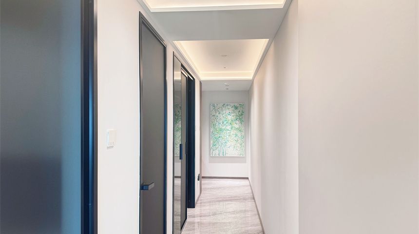 通往客厅的过道做了造型吊顶,搭配“见光不见灯”的线型灯带,巧妙弱化了层高压抑感