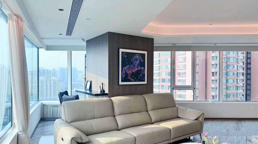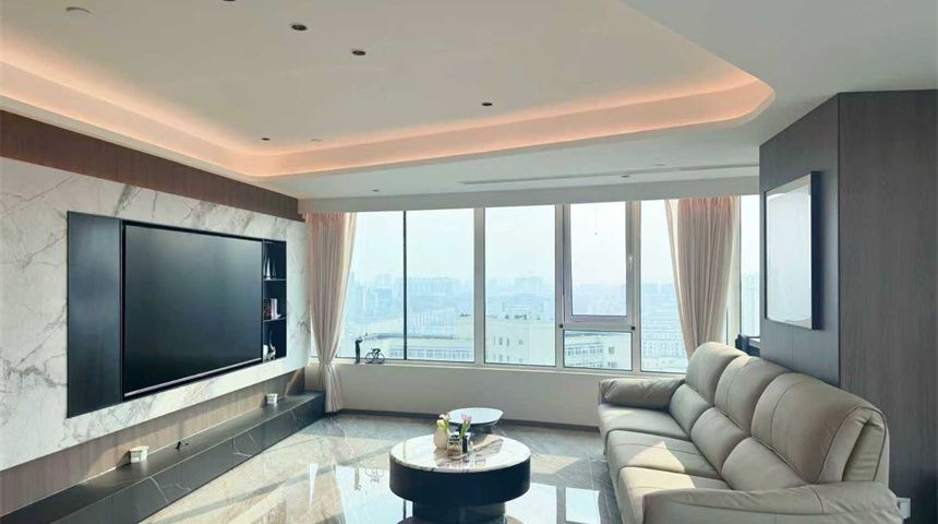 客厅是270°环景采光,通透又明亮。电视嵌入背景墙,一侧定制了不锈钢壁龛,精致又实用;餐桌上方安装了吊灯