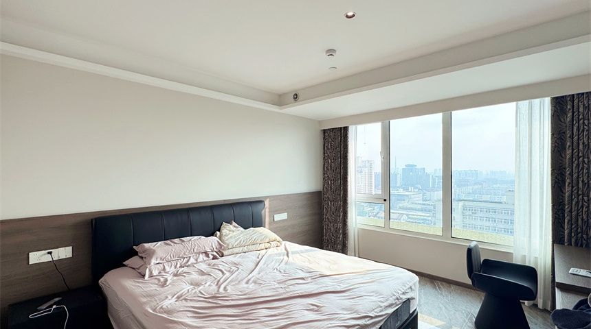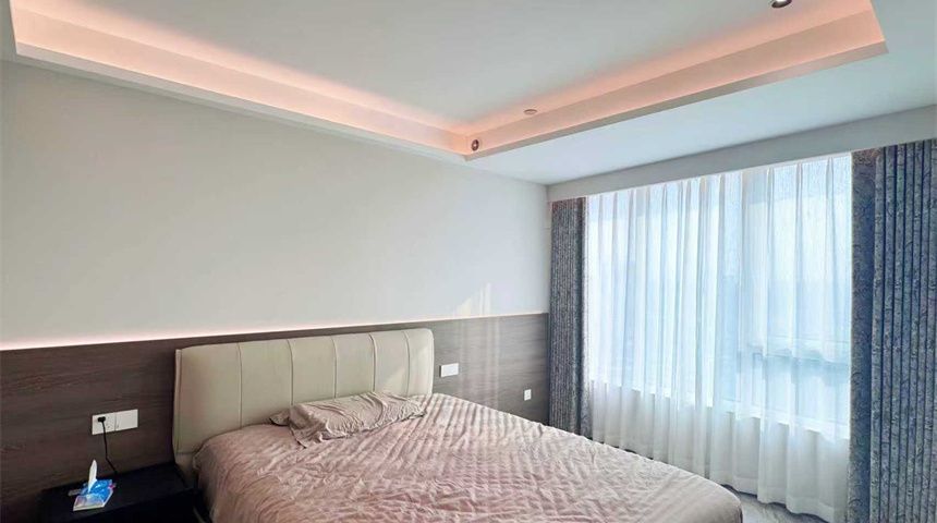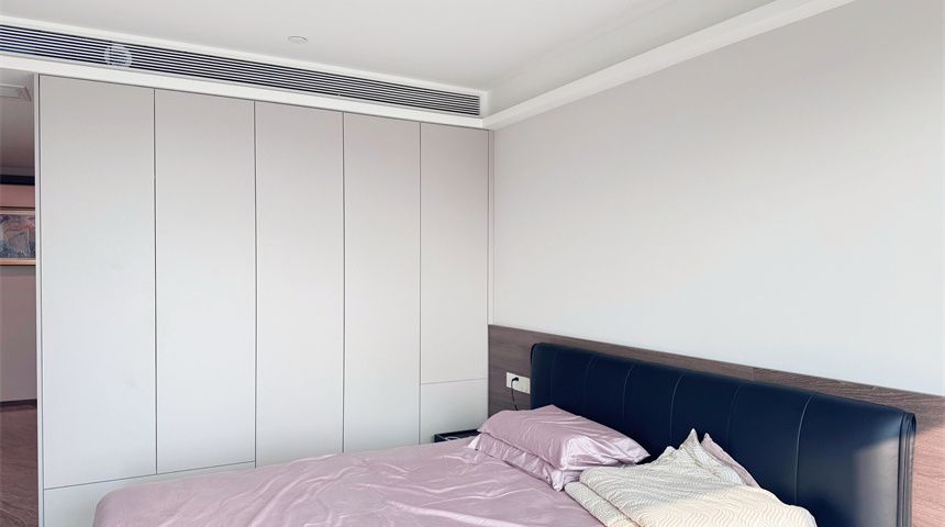 次卧延续无主灯设计,搭配窗帘盒、定制柜体与中央空调长条出风口,简约又实用