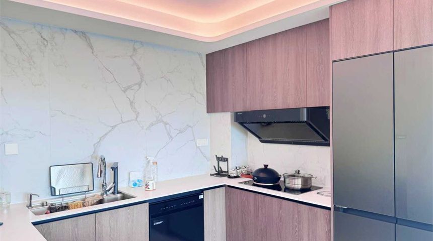 厨房是开放式布局,搭配中岛台更显开阔;L型柜体+高柜设计,冰箱嵌入高柜,美观又节省空间