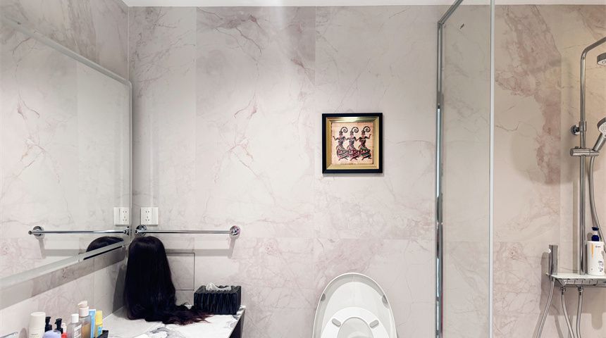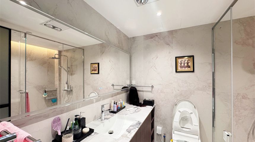 客卫做了干湿分离,石膏板吊顶更显整洁,洗烘一体机嵌入式设计省空间,淋浴区的大理石纹墙砖很有质感