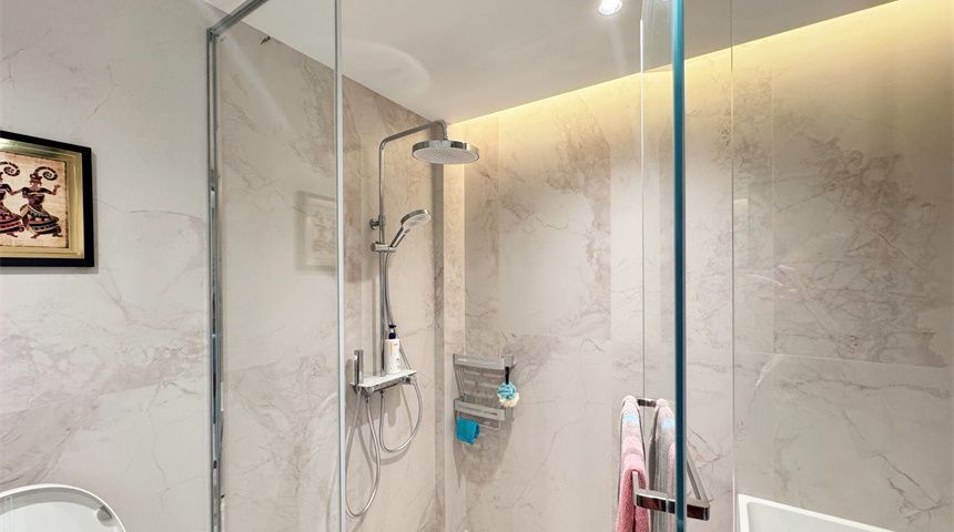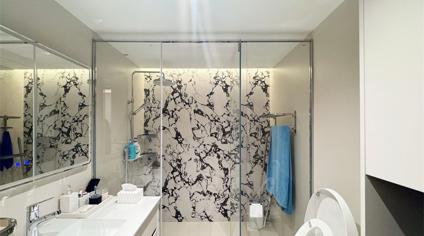 主卫同样干湿分离,石膏板吊顶干净利落,大理石台面洗手台质感十足,淋浴区做了内嵌灯带,氛围感拉满