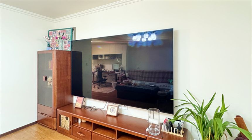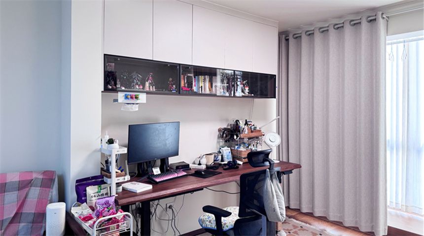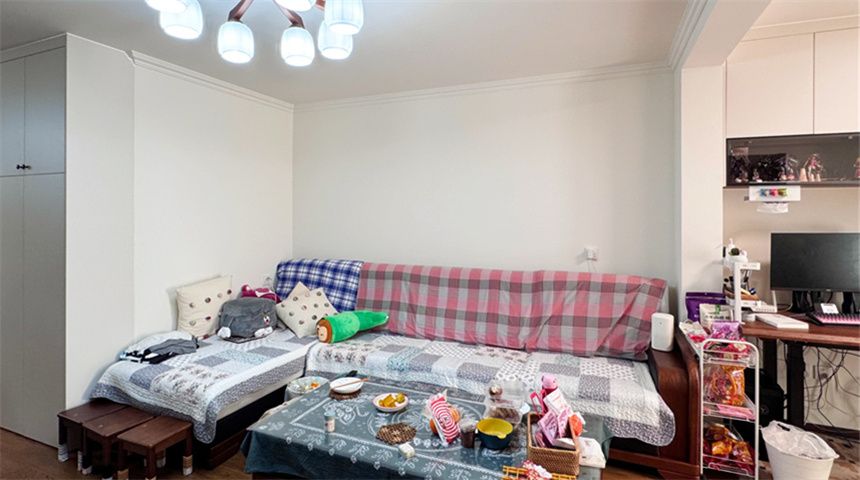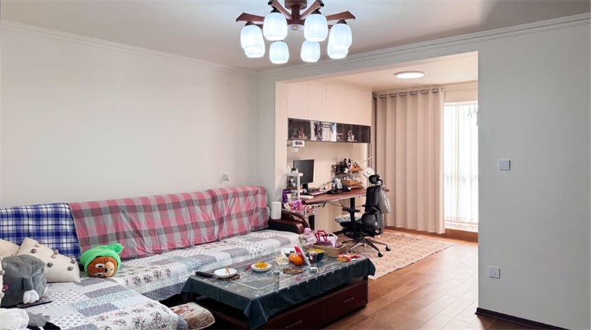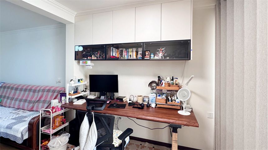 客厅通铺木地板,做平顶+四周石膏线造型,简约大气。电视背景墙原为空心墙,现在灌浆加固,挂电视完全没问题;同时规划了办公区,上方做吊柜增加收纳