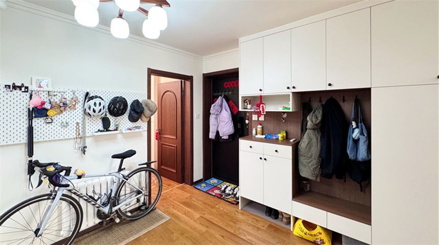 入户门左侧做了一体式定制衣帽柜,收纳更整齐