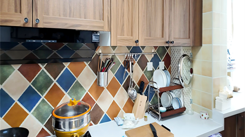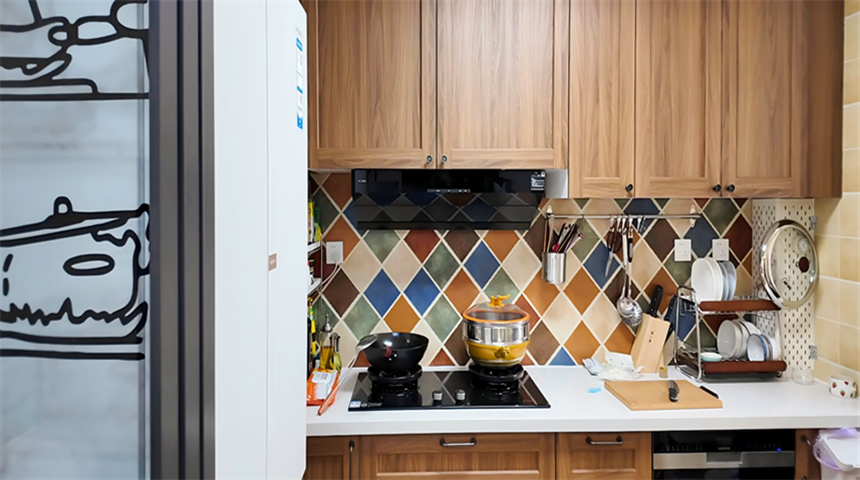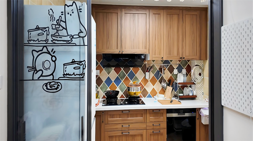 厨房装了三联动推拉门,顶面做300*600吊顶,操作台上方做了收纳柜,墙面中间铺贴了仿古砖,层次更丰富