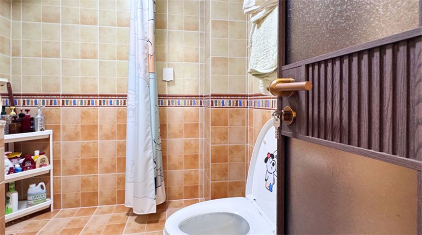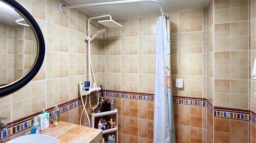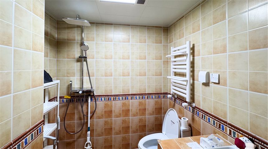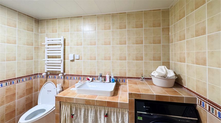 主卫做干湿分离,洗手台也是水泥砌成,顶面装300*600铝扣板,地砖墙地对缝,还走了一圈腰线,细节更精致