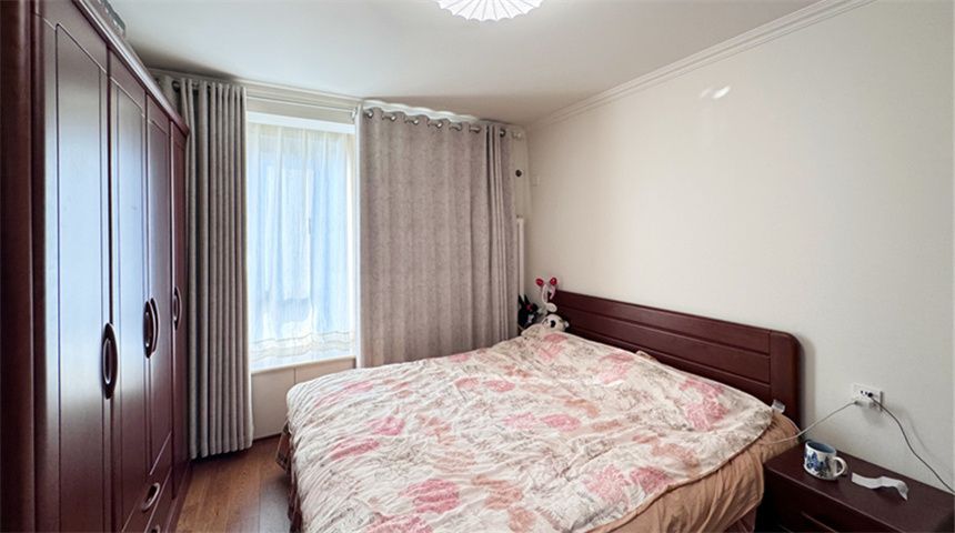 主卧同样通铺木地板,做平顶造型,搭配木质衣柜,温馨耐看