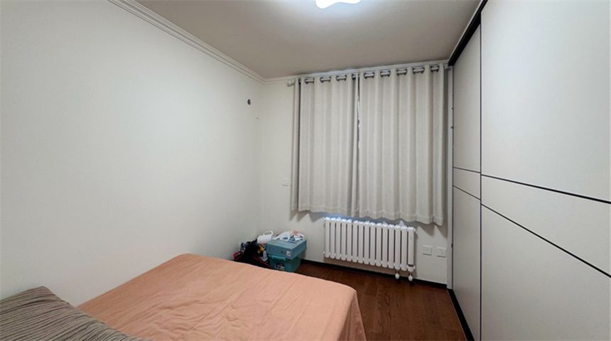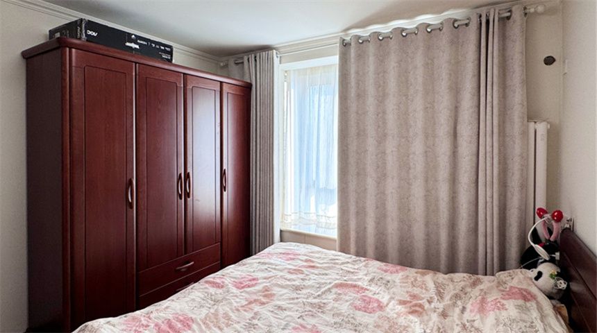 次卧通铺木地板,做一门到顶的推拉门衣柜,储物空间充足,整体简约大气
