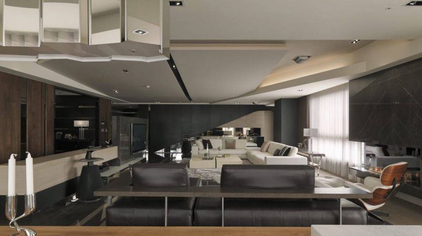 攀拔而起的柜体线条,将视线引导至客厅段落,于深色的材质色调中,白色的设计款沙发宛如展示中的艺术品。