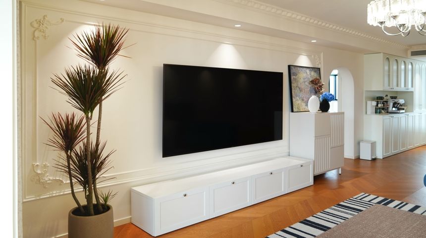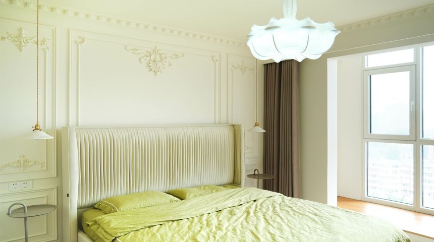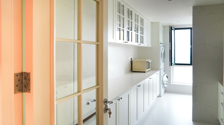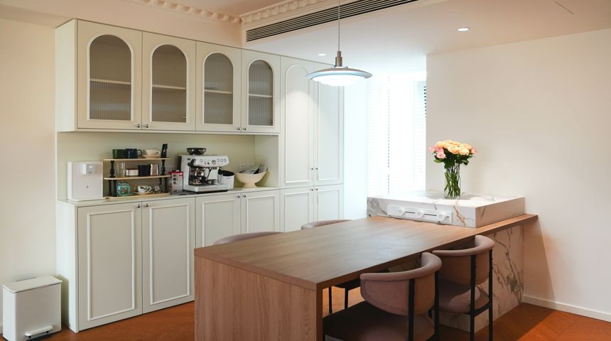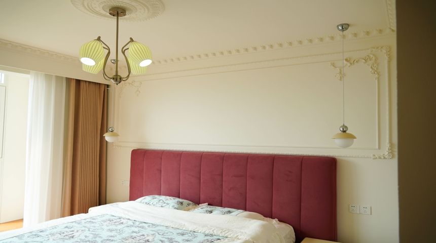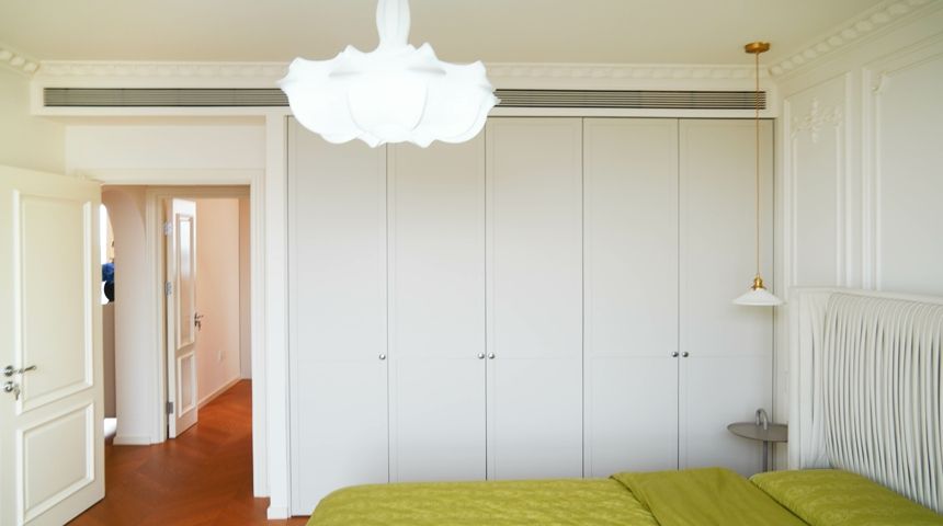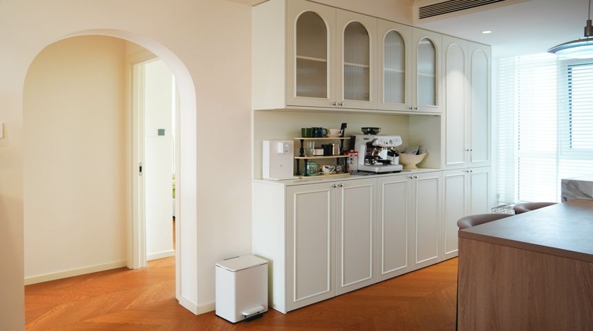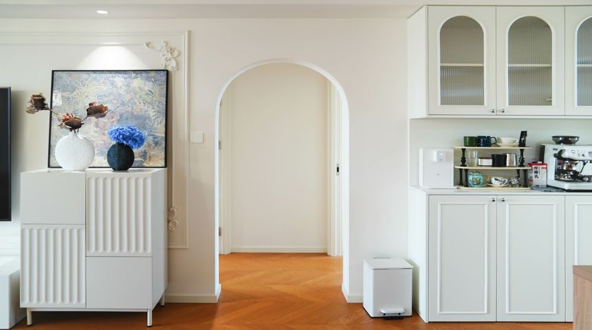 本案为法式奶油风。地面通铺人字拼木地板,空调做加长出风口搭配虎头石膏线,墙面也用法式石膏线装饰,涂刷暖色墙漆更显温馨。两个卧室拆除阳台门扩大室内面积,次卧安装内嵌式衣柜,阳台也改造储物柜增加收纳。厨房做成一字型,墙面用800*800地砖上墙,只有竖缝没有横缝整体性好,性价比高,顶面用防水石膏板搭配内嵌筒灯。卫生间干湿分离,做墙排洗脸盆,没有卫生死角,顶面用防水石膏板做了反光灯槽,设计感满满更美观。
