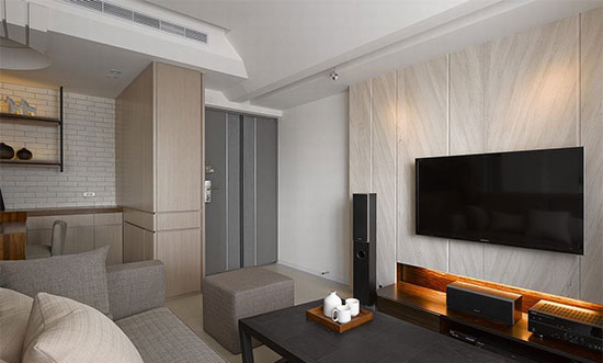 甫入门就有大梁通过,设计师利用角度关系,规划出倾斜造型,修饰结构的突兀存在。
