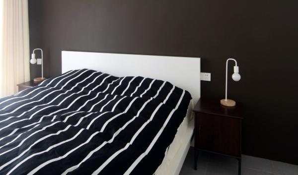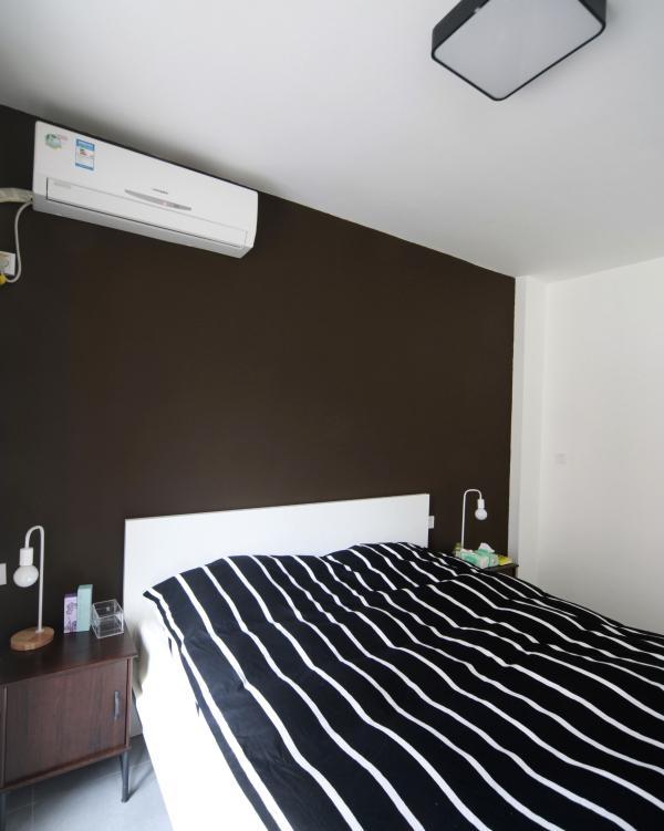 卧室墙面是很深的褐色,接近黑色,想知道乳胶漆色号的朋友可以问我,卧室也非常的简单,一张宜家买的床,两个床头柜,一个空调,一盏吸顶灯,床品是设计师送的所以和整个房间非常的搭,拍照的时候房主已经入住了,所以床头柜上还有一些私人用品,右侧是一扇大大的窗户,采光度非常好。