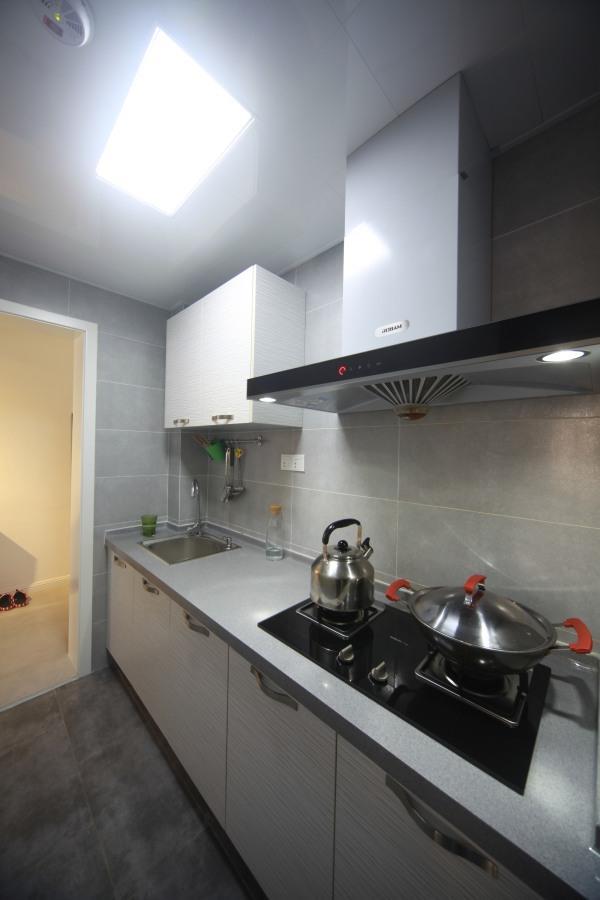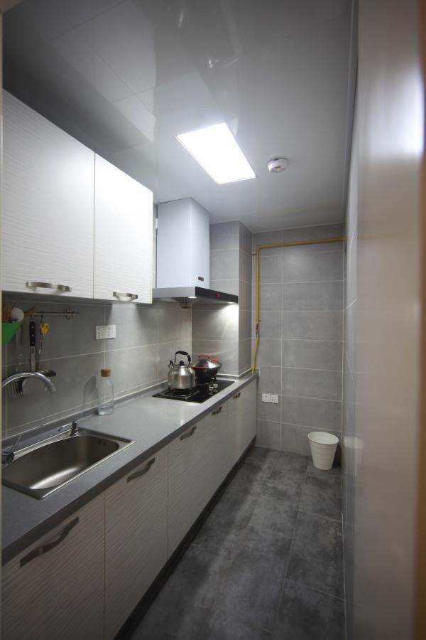 一字型的厨房,的柜体都是米白色的,无边框设计,棱角分明,简洁感比较强,地面用的墙砖地砖和客厅是同一款,顶面是铝扣板的吊顶,两个吸顶灯,垃圾桶的位置是生活阳台的入口,照片角度问题看不到门。