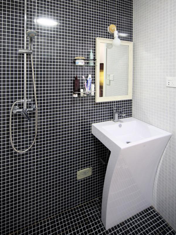 整个空间用的都是马赛克瓷砖,颜色是黑配白,因为一个人住,只做了两个小小的壁式悬挂的架子天花板没拍到,和厨房的是同一款。