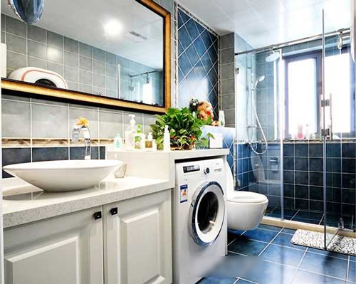 小卫生间不要安装柱盆,因为下面的柱体空间无法利用,浪费了本身有限的空间;选择台上盆为佳,下面安装台下面盆柜,容积也会大一些,可以多容纳一些东西,设计师设计的面盆、洗衣机结合在一起,不仅节约空间,而且增加了面盆的面积,方便放置很多东西,巧妙的利用了空间;另外洗衣机上养一盆生命力旺盛的小草,起到很好的装饰作用(如上图)。另外小卫生间要选择占地面积小的马桶,市面上最常见的马桶分为整体和分体两种,整体马桶因为水箱和座厕是一次成型,报废率比较高,价格比样式差不多的分体马桶贵一些,占地面积也要大一些,而分体马桶可以省些空间,隐蔽水箱的设计可以节约至少20厘米的距离,在小户型卫生间里选择分体马桶既省地又省钱,如上图所示,选用的分体马桶,马桶的隐蔽水箱已埋在墙内,是看不到的。