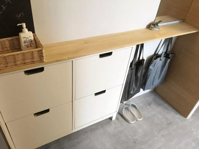 17厘米的窄鞋柜贴边放,和鞋柜一样宽的柳条筐也是定制,鞋柜 + 穿衣镜 + 挂包钩,使有限的玄关形成一个完整的整体。