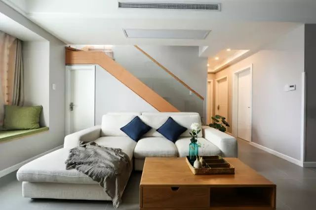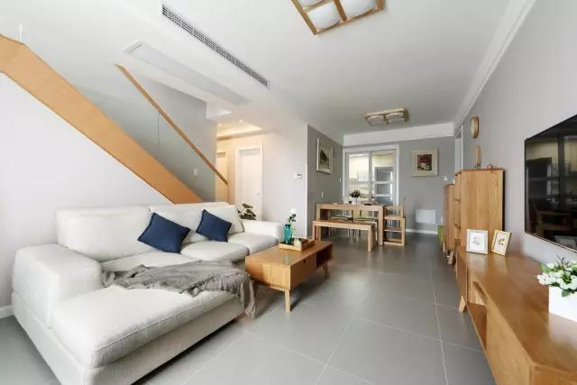 客厅跟餐厅在同一空间,整体是浅色基调,墙面刷成淡淡的灰色,再搭配木色家具,楼梯也做成木色,让整个客餐厅在时尚大方的同时又不显冰冷。